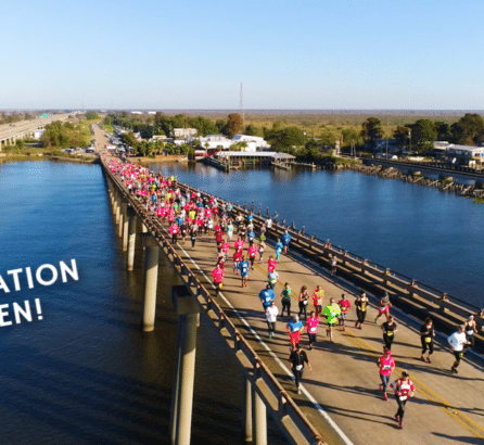 A table with plates of fried fish, lemon wedges, French fries, salad, hot sauce, and a drink, viewed from above.