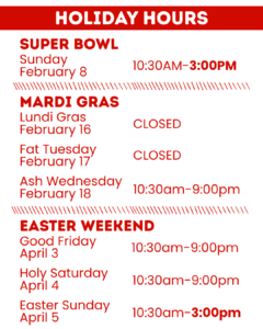 We have a couple of changes to our hours coming up in the next few months. We’ll have shorter hours for the Super Bowl (2/8/26) and Easter Sunday (4/5), 10:30am-3:00pm.